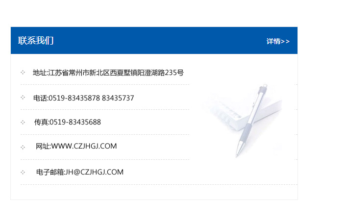 地址:常州市新北區友邦商務大廈1幢16、17層  電話:0519-85101652  傳真:0519-85112595  郵編:213022  網址:www_cz-jiayue_cn.jsyazhi.com  郵箱:xiajifengaa@163.com